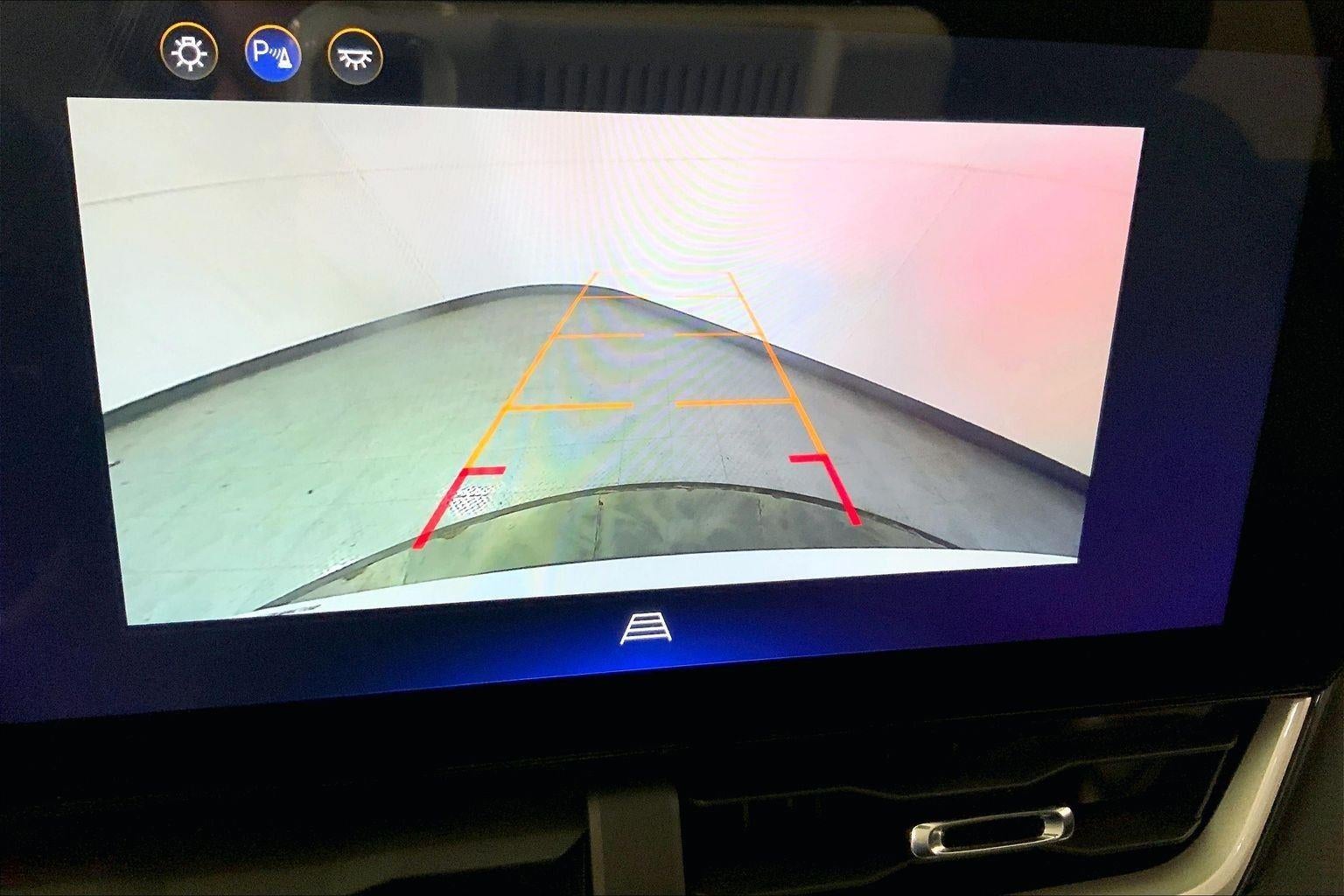 - The vehicle is equipped with a camera that displays an image of the area behind the vehicle on an interior display.