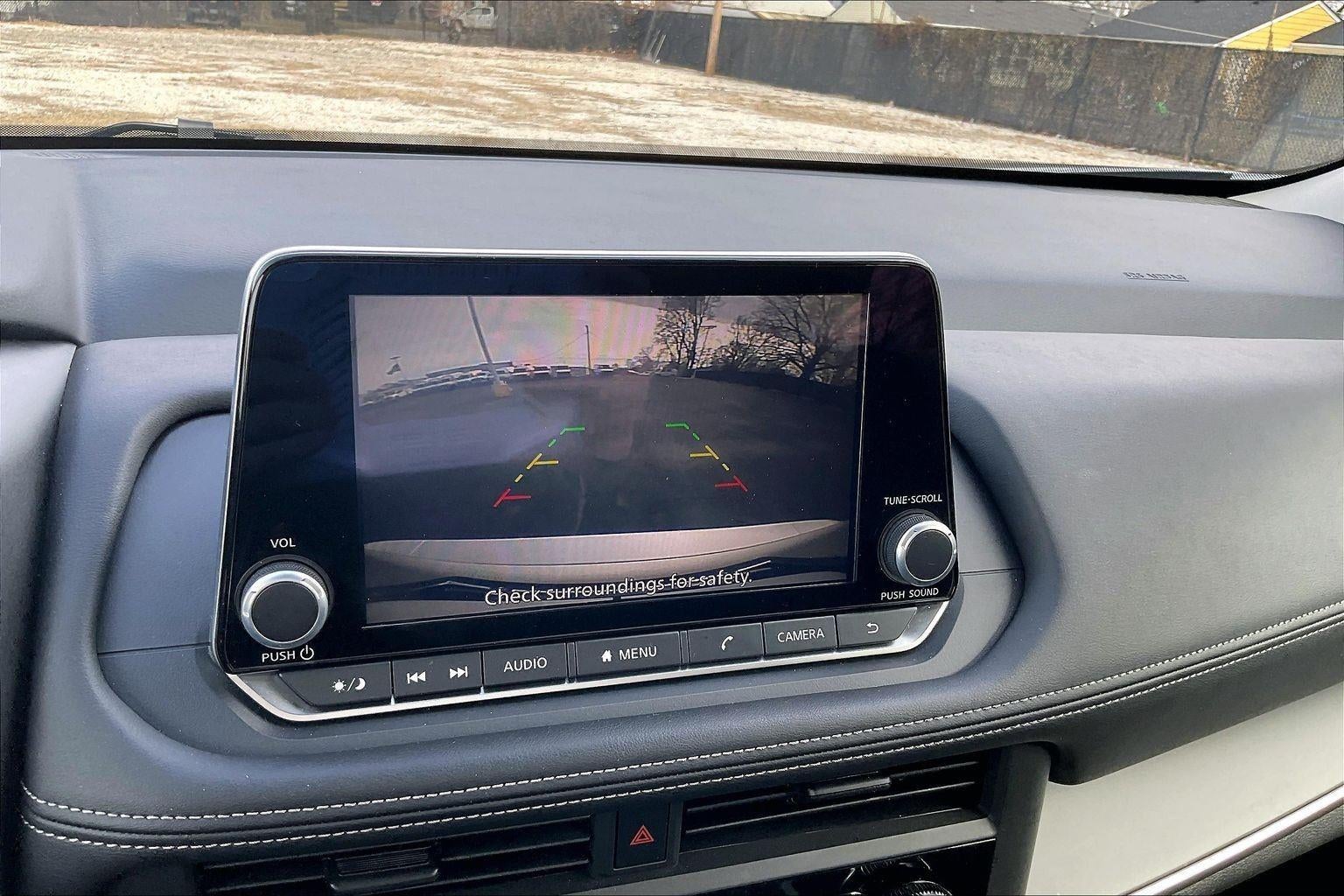 - The vehicle is equipped with a camera that displays an image of the area behind the vehicle on an interior display.